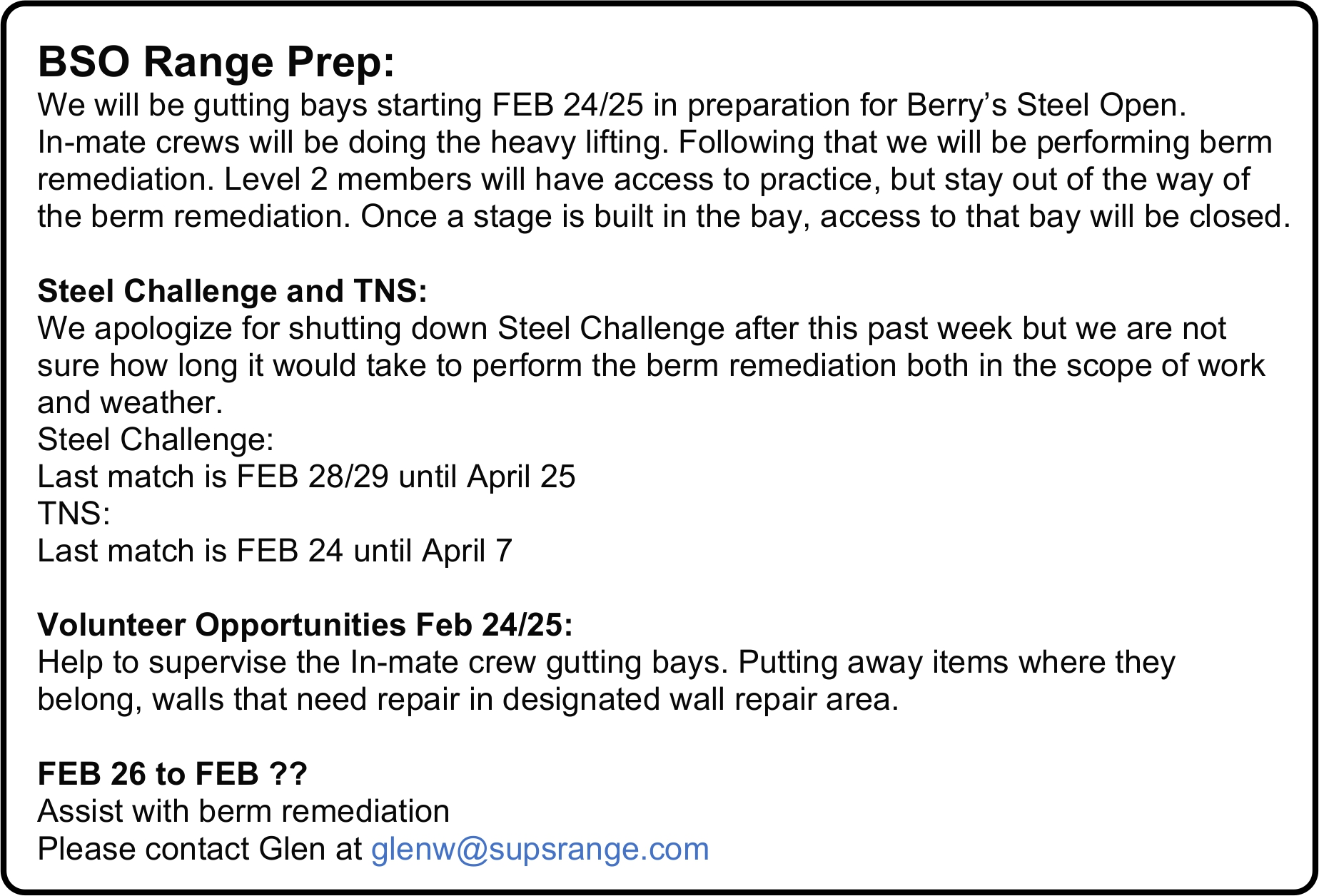 If you are interested in joining the email list for various range activities (builds, inventory, clean up, match prep, etc.)